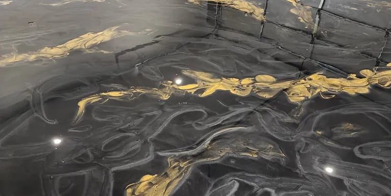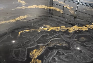 A marble epoxy floor (often called a metallic epoxy floor) is a high-end coating system designed to mimic the swirling, organic depth of natural stone. It uses metallic pigments mixed into clear epoxy that are manipulated with rollers, brushes, or even leaf blowers during installation to create unique, one-of-a-kind veining and "movement.